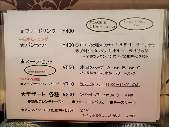 The menu includes enticing options like the パンセット for 500 yen or the スープセット, which pairs choices of bread or rice with a nourishing soup and a small dish, priced at 650 yen. Lunch enthusiasts can elevate their meals with a hearty hamburger for just an additional 250 yen during lunch hours.